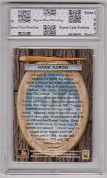 This is a Hank Aaron 1994 Ted Williams Company 500 Home Run Club #5C1 Insert card that has been graded a Mint 8.5 by Sigma Grading.  The holder has some light surface wear, but overall this is a sharp graded card of this baseball Hall of Famer.