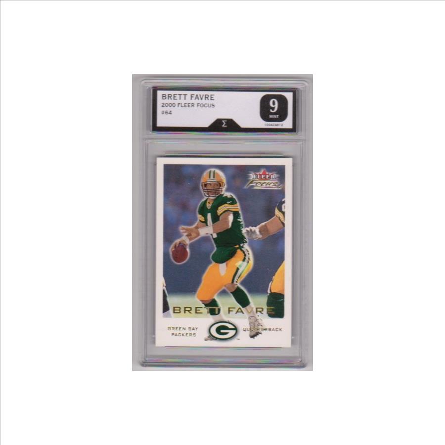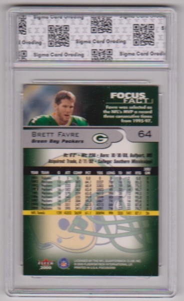 This is a Brett Favre 2000 Fleer Focus #64 card that has been graded a Mint 9 by Sigma Grading.  The holder has some light surface wear/scuffs, but overall this is a sharp graded card of this NFL Hall of Famer.