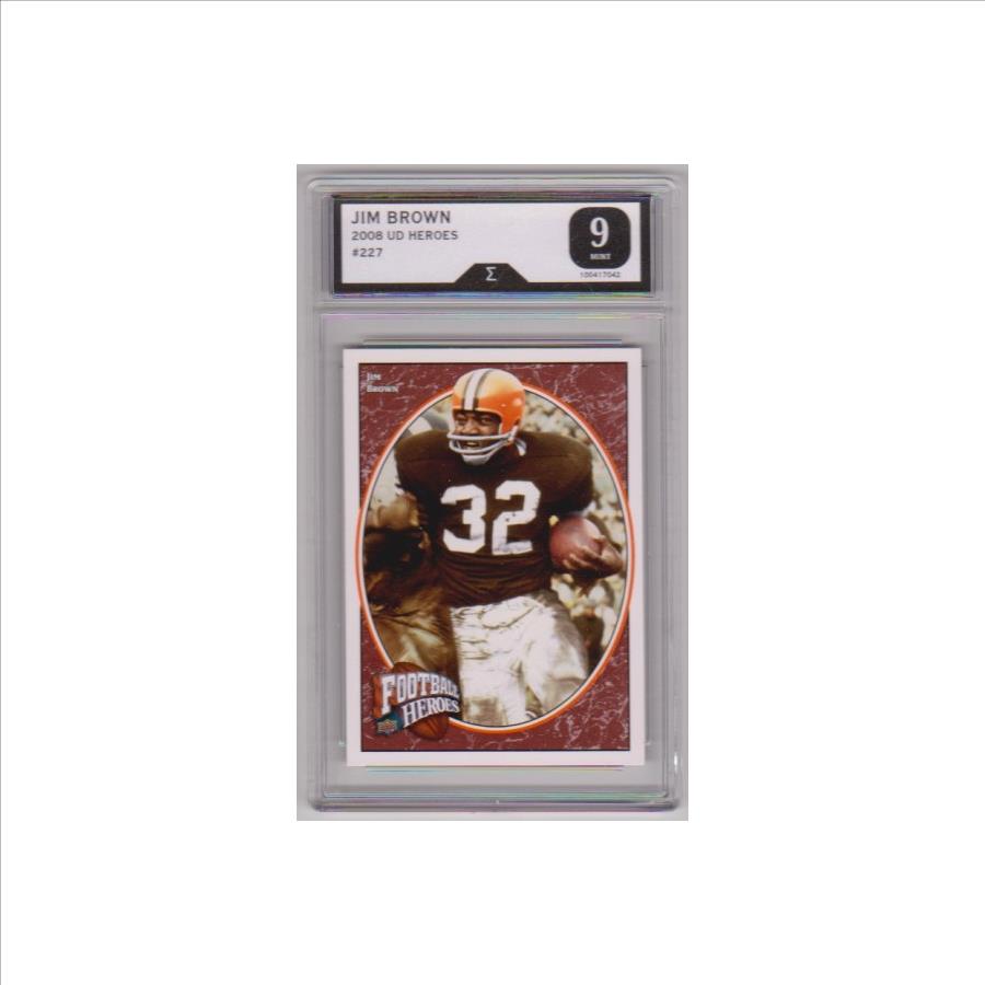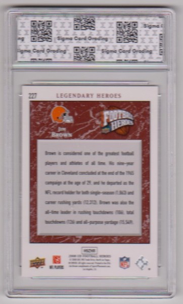 This is a Jim Brown 2008 Upper Deck Football Heroes #227 card that has been graded a Mint 9 by Sigma Grading.  The holder has some light surface wear, but overall this is a sharp graded card of this NFL Hall of Famer.