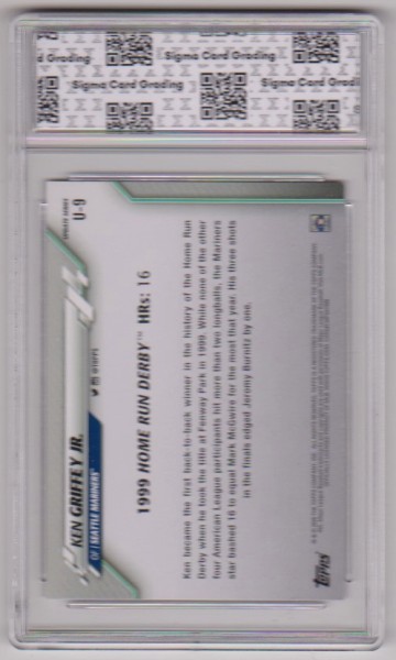This is a Ken Griffey, Jr. 2020 Topps Update #U-9 card that has been graded a Mint 9 by Sigma Grading.  The holder has some light surface wear, but overall this is a sharp graded card of this baseball Hall of Famer.