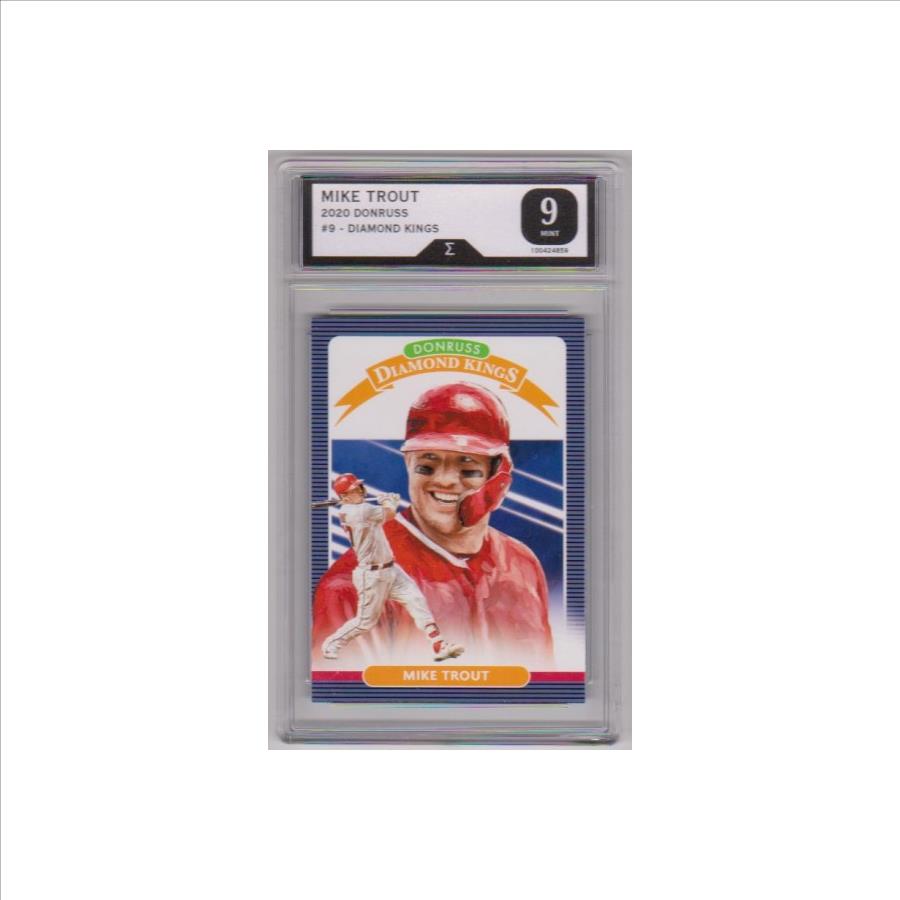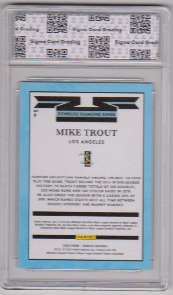 This is a Mike Trout 2020 Donruss Diamond Kings #9 card that has been graded a Mint 9 by Sigma Grading. The holder has some minor surface wear, but overall this is a nice looking graded card of this baseball star.