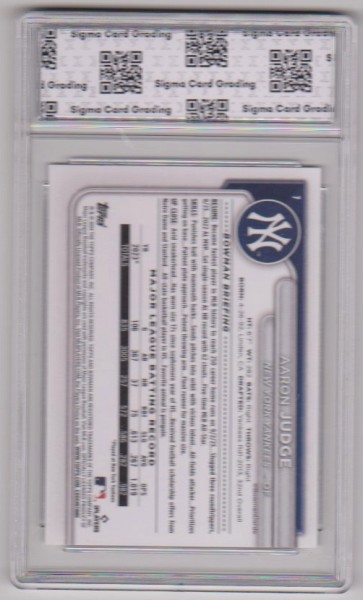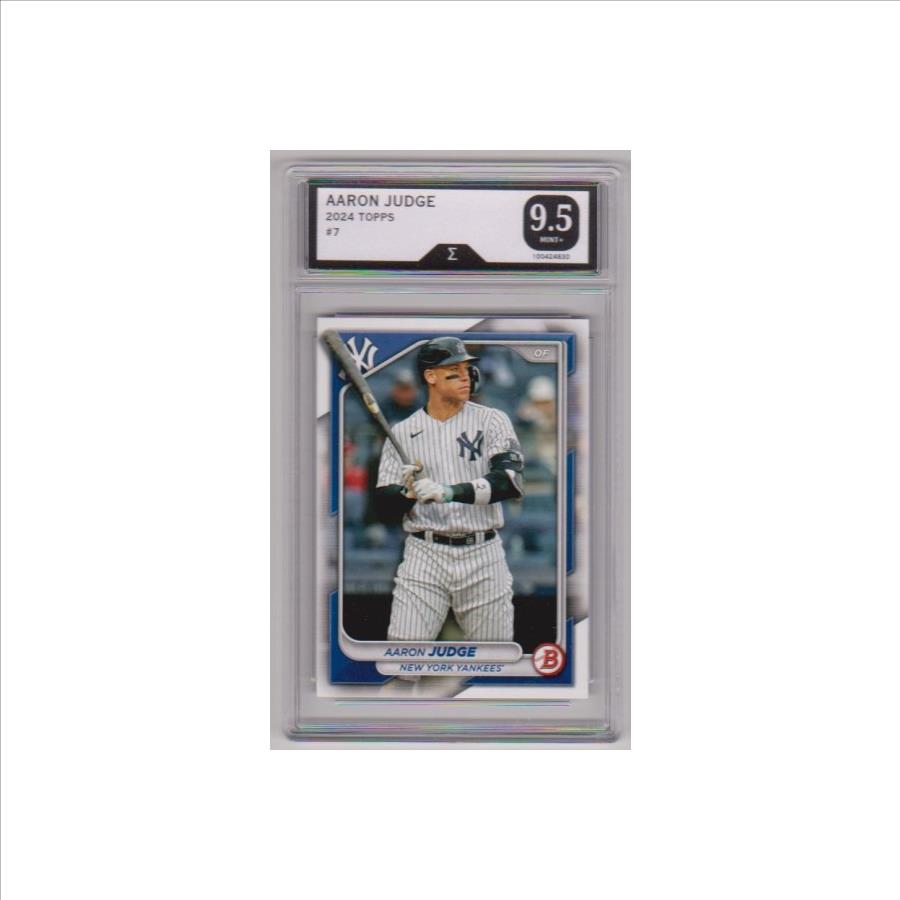 This is a Aaron Judge 2024 Bowman #7 card that has been graded a Mint+ 9.5 by Sigma Grading. Sigma incorrectly labeled the card as a 2024 Topps. The holder has some light surface wear, but overall this is a sharp graded card of this baseball star.