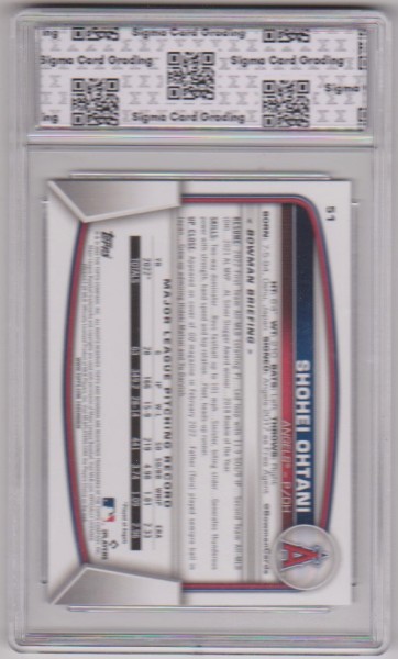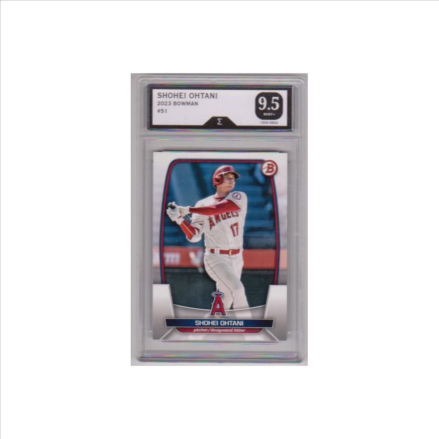 This is a Shohei Ohtani 2023 Bowman #51 card that has been graded a Mint+ 9.5 by Sigma Grading.  The holder has some light surface wear, but overall this is a sharp graded card of this baseball star.