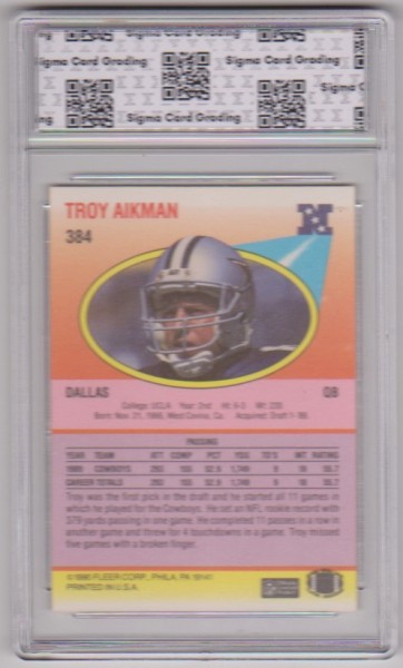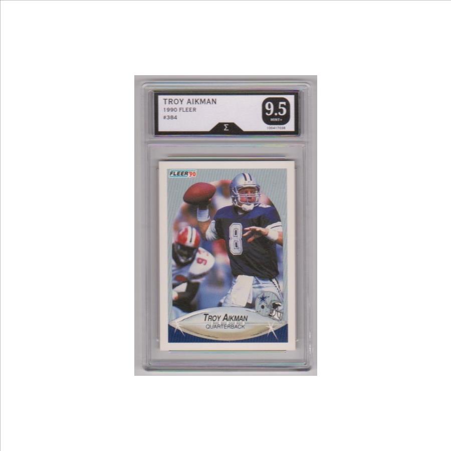 This is a Troy Aikman 1990 Fleer #384 card that has been graded a Mint+ 9.5 by Sigma. The holder has some very light surface wear, but overall this is a nice looking graded card of this NFL Hall Of Famer.