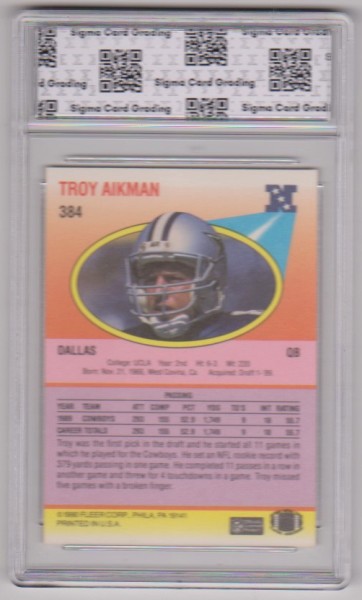 This is a Troy Aikman 1990 Fleer #384 card that has been graded a Mint+ 9.5 by Sigma. The holder has some very light surface wear, but overall this is a nice looking graded card of this NFL Hall Of Famer.