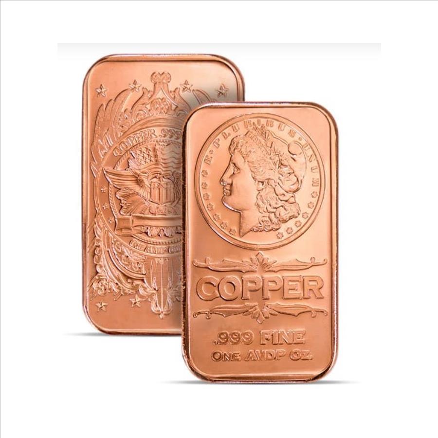 Bar Highlights Purity: 99.9% copper (minimum) Weight: 1 standard (avoirdupois) ounce Size: 1.85” x 1.08” x 0.11” thick Design Details Obverse: Showcases a rendition of the Morgan Dollar Liberty Head, originally designed by George T. Morgan in 1878. The classic design features a left-facing portrait of Lady Liberty, adorned with a Phrygian cap and a wreath of wheat and cotton, symbolizing freedom and agriculture.