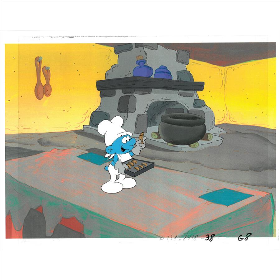 An original hand-painted production cel from the Hanna-Barbera cartoon "The Smurfs." This cel features Greedy Smurf and is registered to an offset lithograph background, with the character painted on acetate production cel. There are numbers and inscriptions written throughout. This piece is presented unframed, in protective plastic sleeve with a COA from Classic Moments.