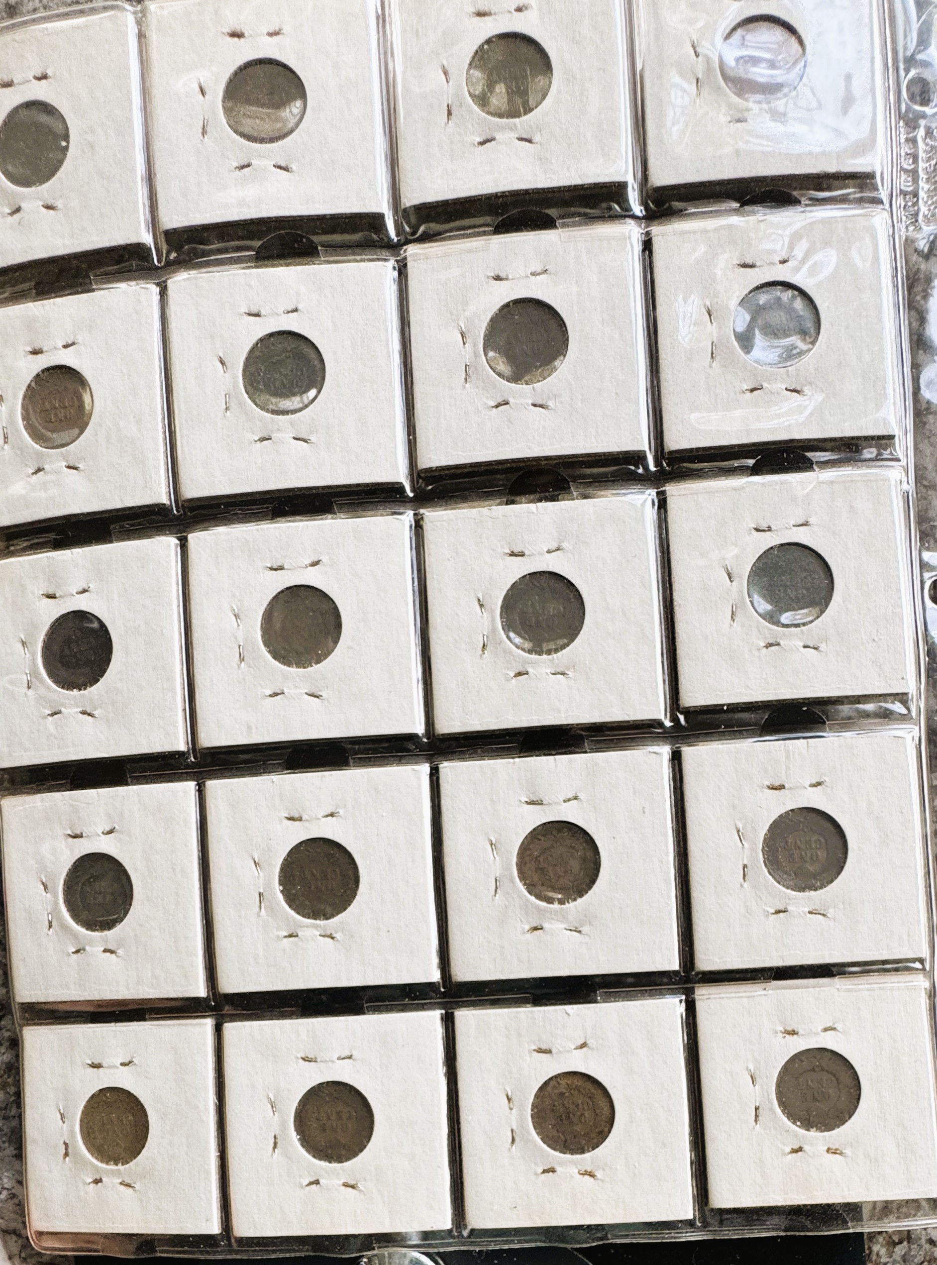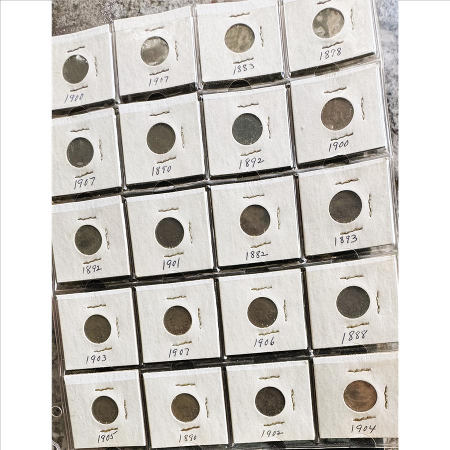 INDIAN HEAD CENT SET, COLLECTION OF 20 VARIOUS DATES 1882- 1907, NICE COINS BUT HARD TO PHOTO IN PROTECTIVE FLIPS AND PAGE COVER
