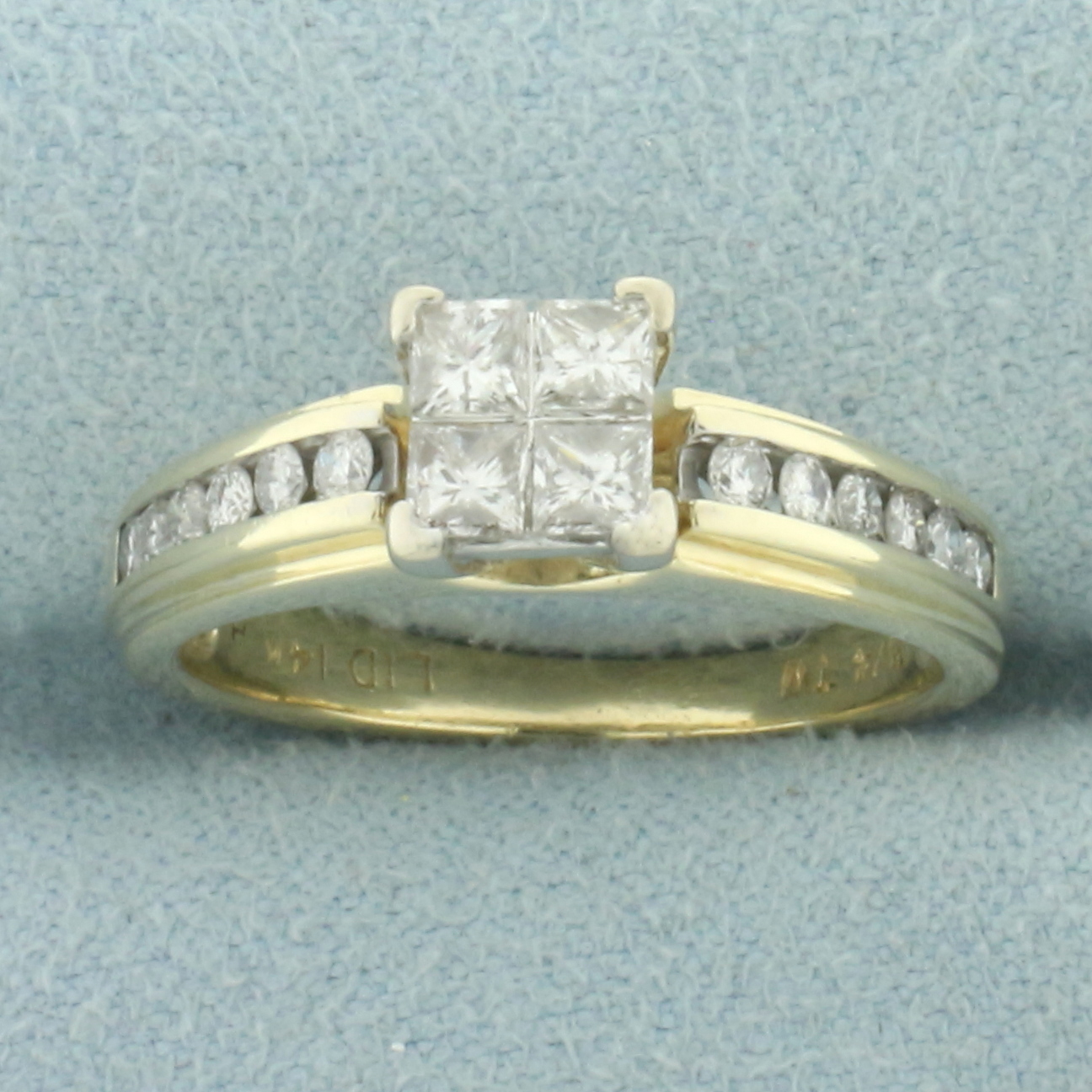 In 14k yellow gold. Contains four high quality princess cut diamonds, 1/2ct TW, SI clarity/H color. Diamonds invisible set to look like one large 1ct princess cut diamond. Also contains twelve high quality round diamonds, 1/4ct TW, of similar high quality. Size: 7. 4.4g.