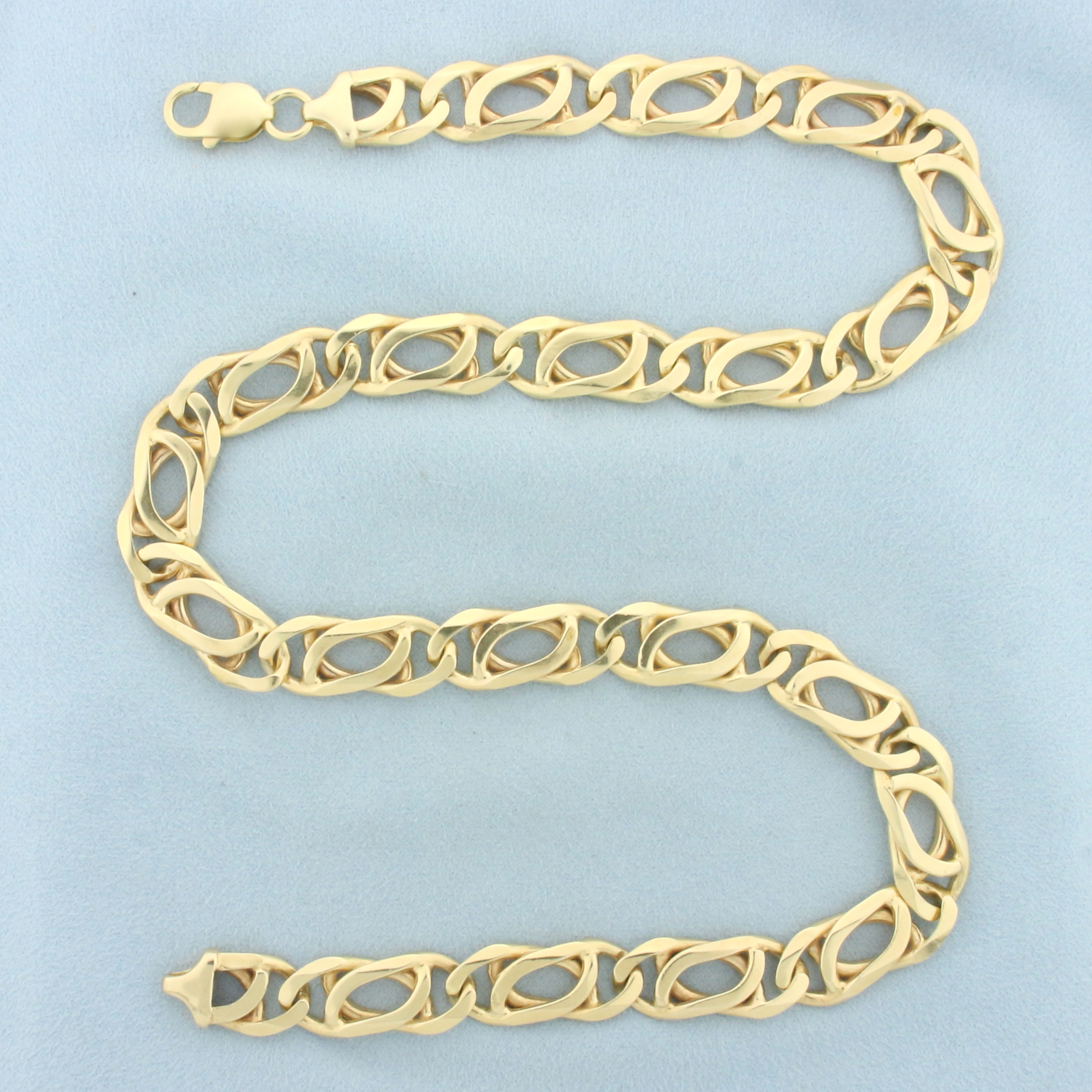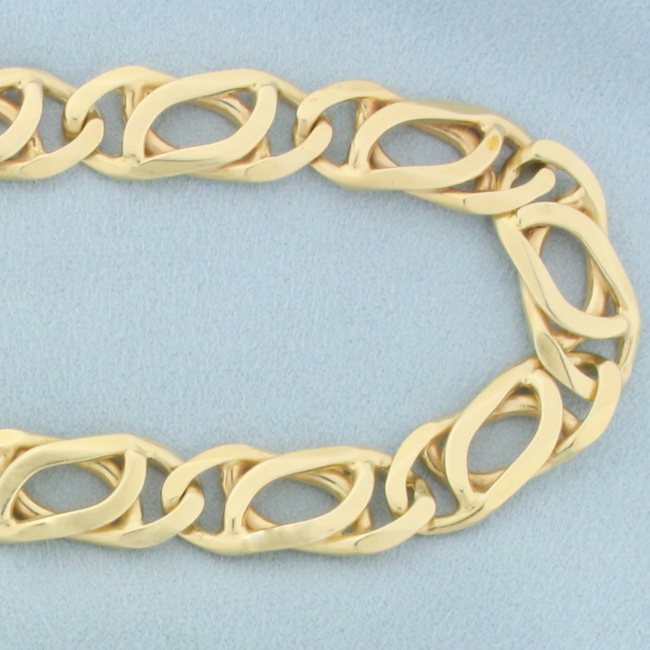 In 14k yellow gold. Solid links. 20.5 inches long, 11.7mm wide. Lobster clasp. 95.7g.