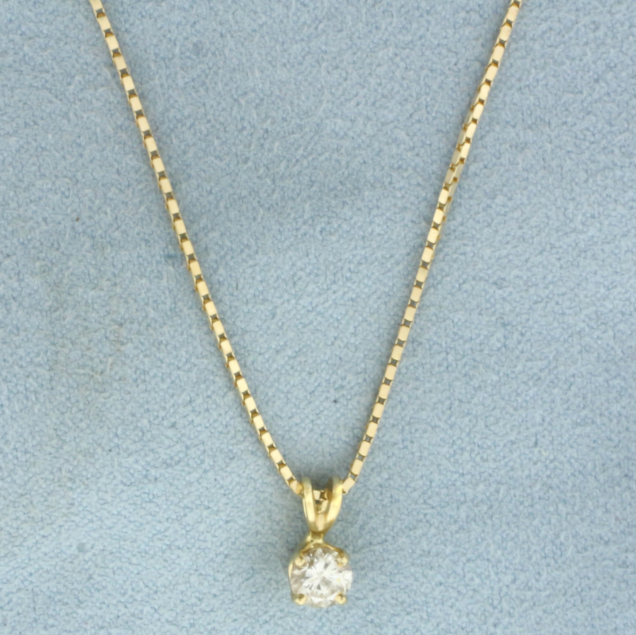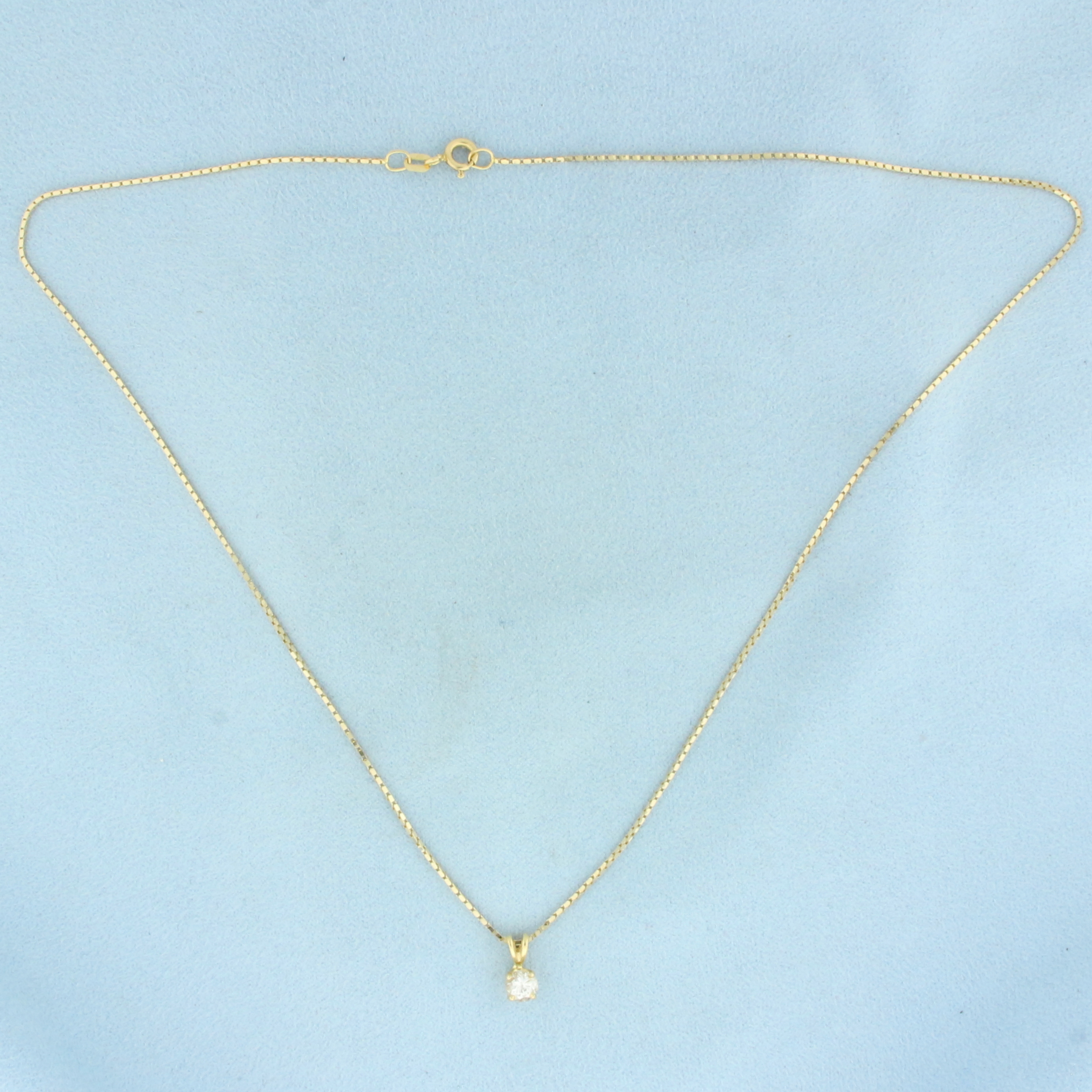 In 14k Yellow Gold. Contains one high quality 1/3ct round brilliant diamond,SI2 clarity/I color. 18 inch long .85mm wide box link chain. Italian made. Spring clasp. 2.7g.