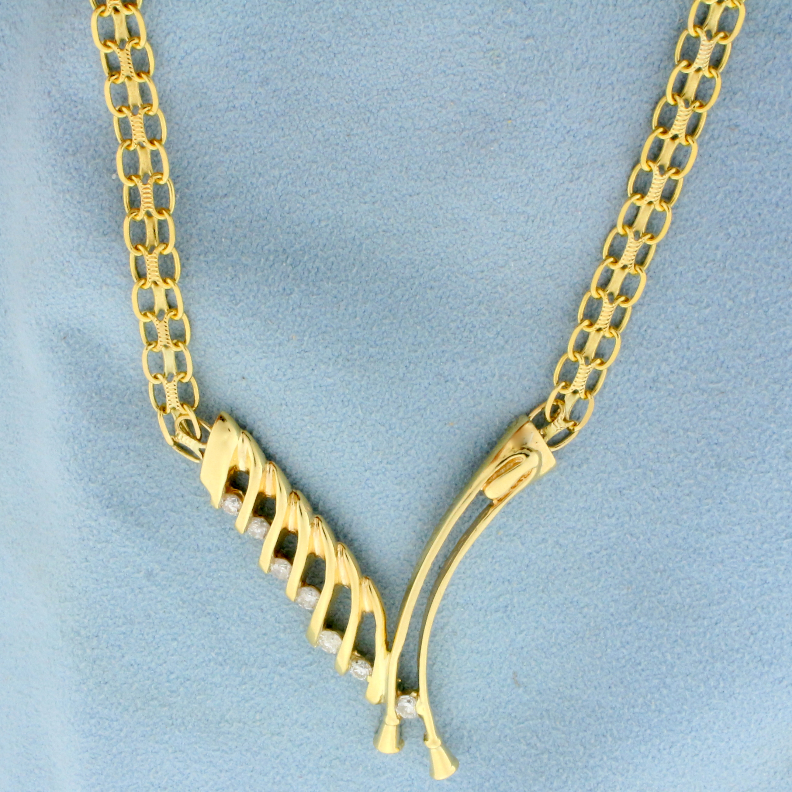 In 14K Yellow Gold. Contains seven high quality Diamonds, 1/2ct TW, SI clarity/H color. 20 inches long, with lobster clasp. Pendant part is 1 3/4 inches long. 15.7g.