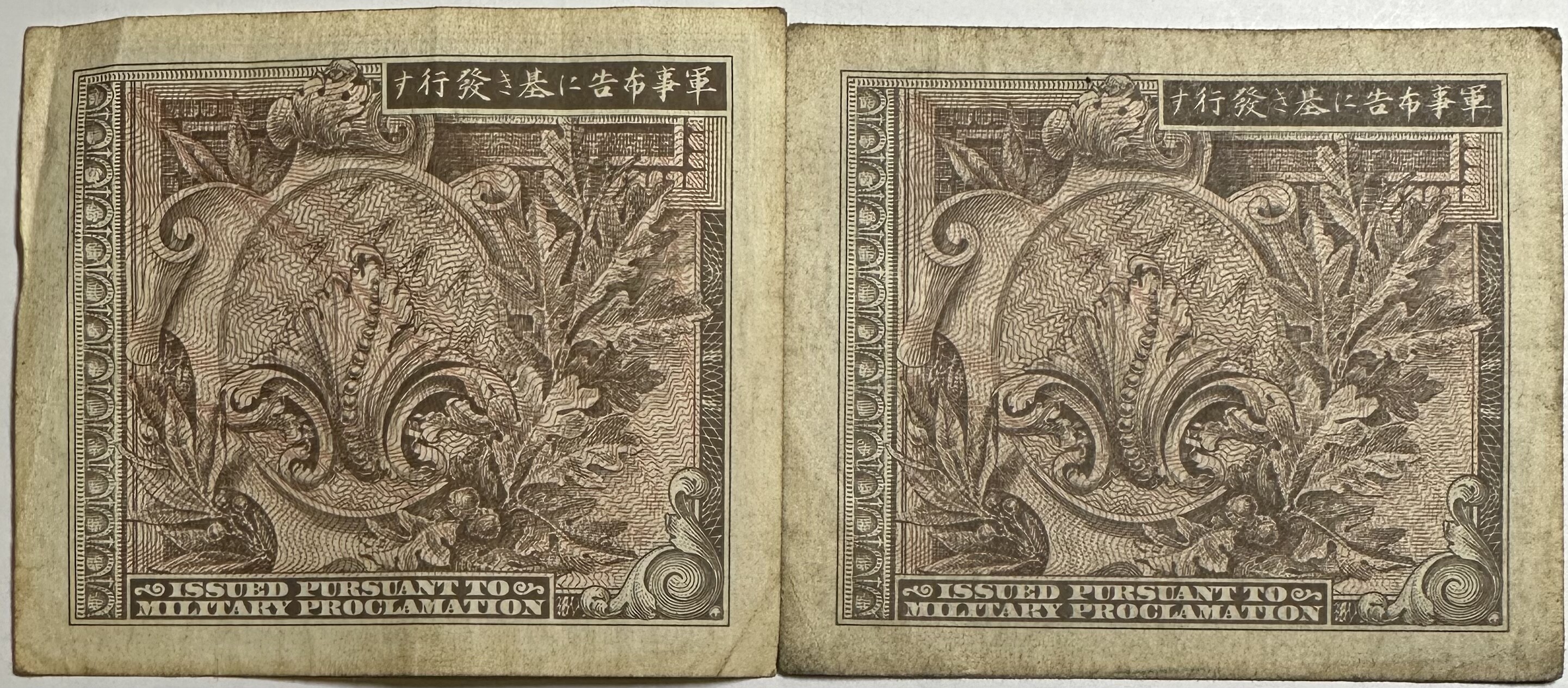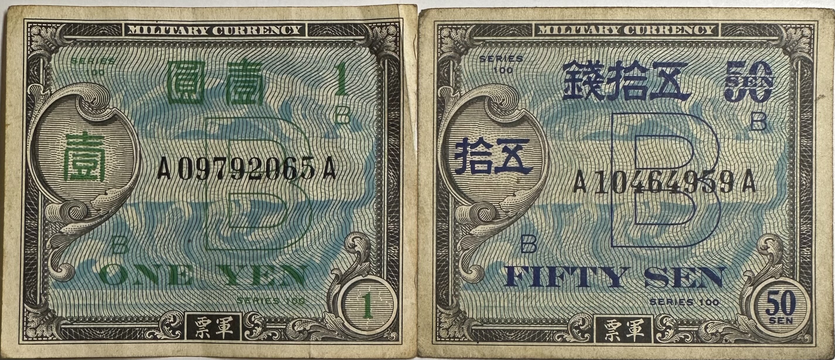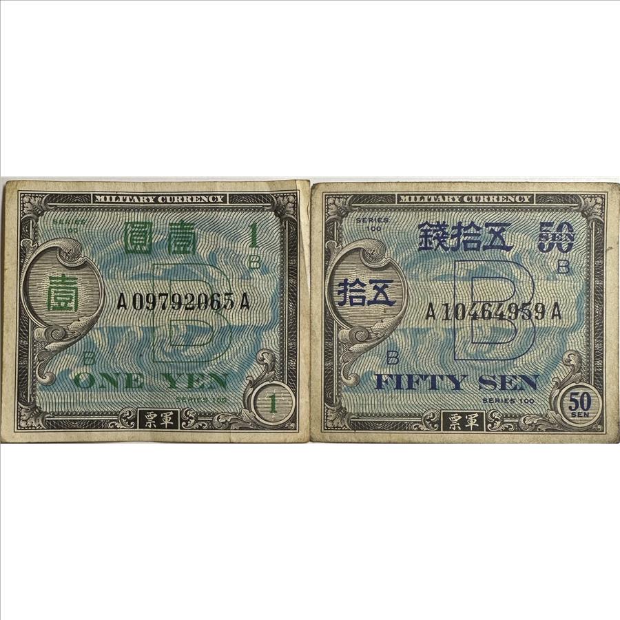 >Japan Series 100 Military Currency - One (1) Yen and Fifty (50) Sen Banknotes - 2 Notes, Square in Shape