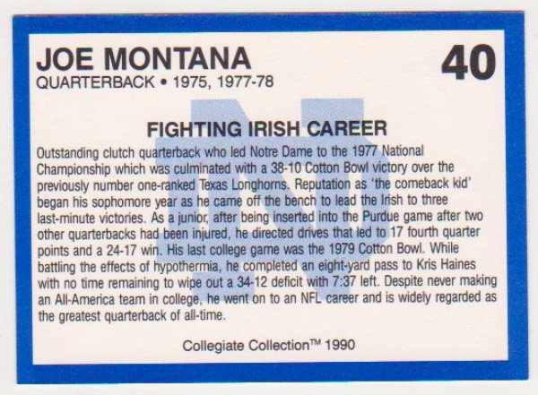 Joe Montana 1990 Notre Dame #40 Collegiate Collection Card