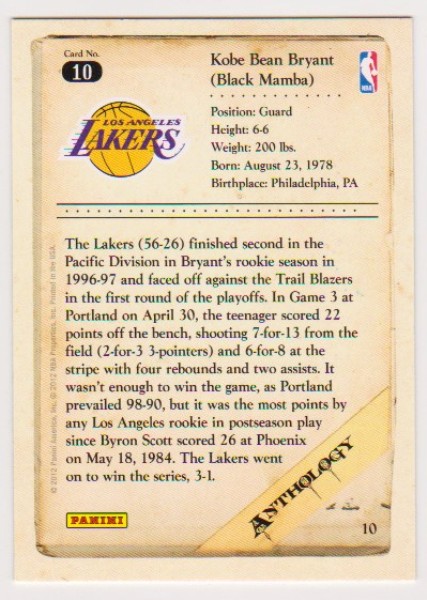 This is a 2012 Panini Anthology Kobe Bryant #10 card.  This is an approximately Near Mint condition card of this NBA Hall Of Famer.
