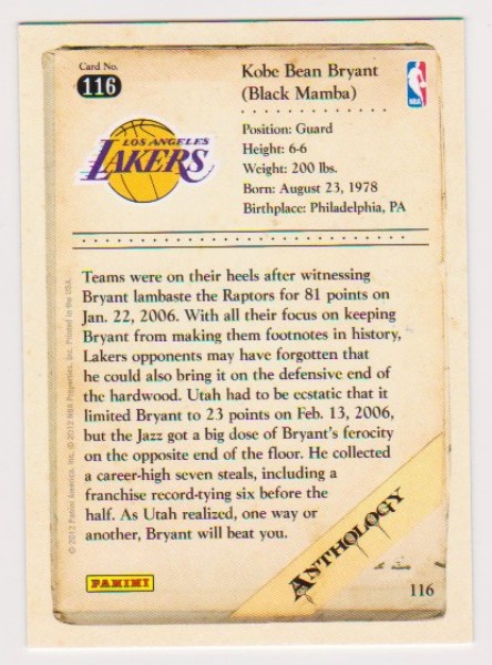 This is a 2012 Panini Anthology Kobe Bryant #116 card.  This is a nice approximately NM-MT condition card of this NBA Hall Of Famer.