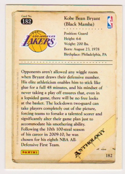 This is a 2012 Panini Anthology Kobe Bryant #182 card.  This is a nice approximately NM-MT condition card of this NBA Hall of Famer.