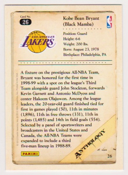 This is a 2012 Panini Anthology Kobe Bryant #26 card.  This is a nice approximately NM-MT condition card of this NBA Hall of Famer.