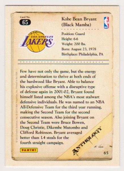 This is a 2012 Panini Anthology Kobe Bryant #65 card.  This is a nice approximately NM-MT condition card of this NBA Hall of Famer.