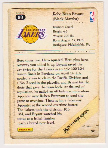 This is a 2012 Panini Anthology Kobe Bryant #90 card.  This is a nice approximately EX-MT to Near Mint condition card of this NBA Hall of Famer.  It has minor wear but overall displays nicely.
