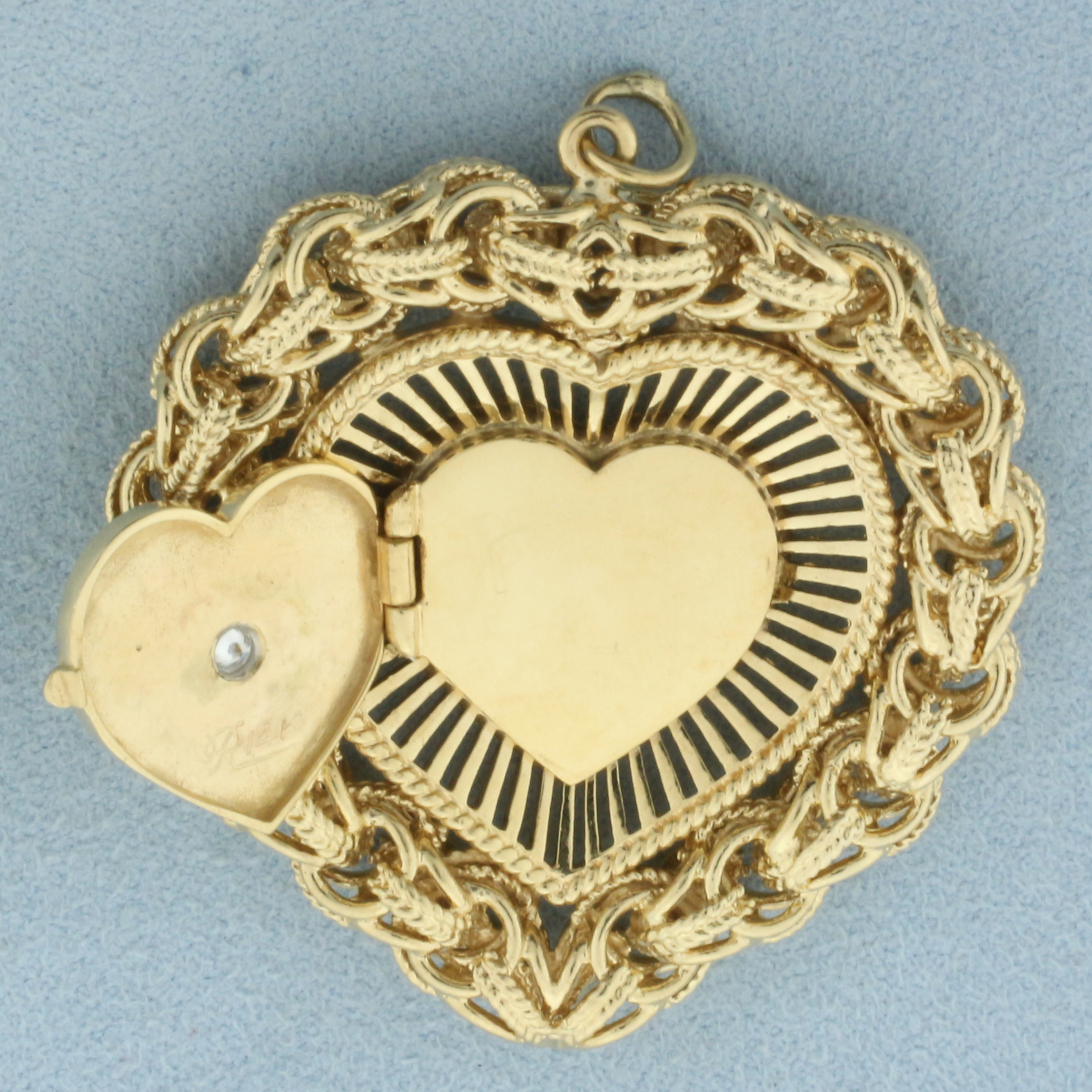 In 14k yellow gold. Contains one high quality .05ct diamond, VS clarity/G color. 2 inches long (including jump ring) and 1 3/4 inches wide. Hinged heart locket in center. 26.3g.