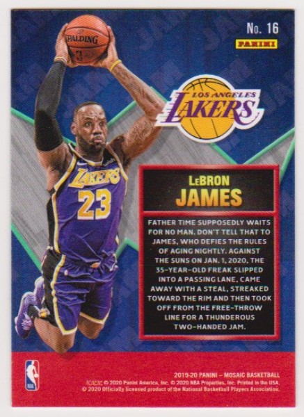This is a 2019-20 Panini Mosaic Lebron James #16 card.  It is an approximately EX-MT to Near Mint condition card of this NBA star.