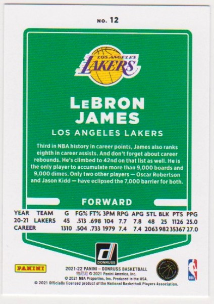 This is a 2021-22 Donruss Lebron James #12 card.  It is a nice approximately NM-MT condition card of this NBA star.