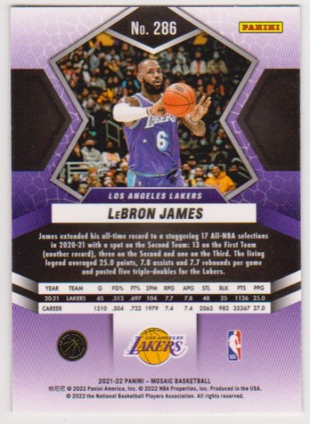 This is a 2021-22 Panini Mosaic Lebron James #286 card.  It is in approximately Near Mint condition.  This is a nice looking card of this NBA star.