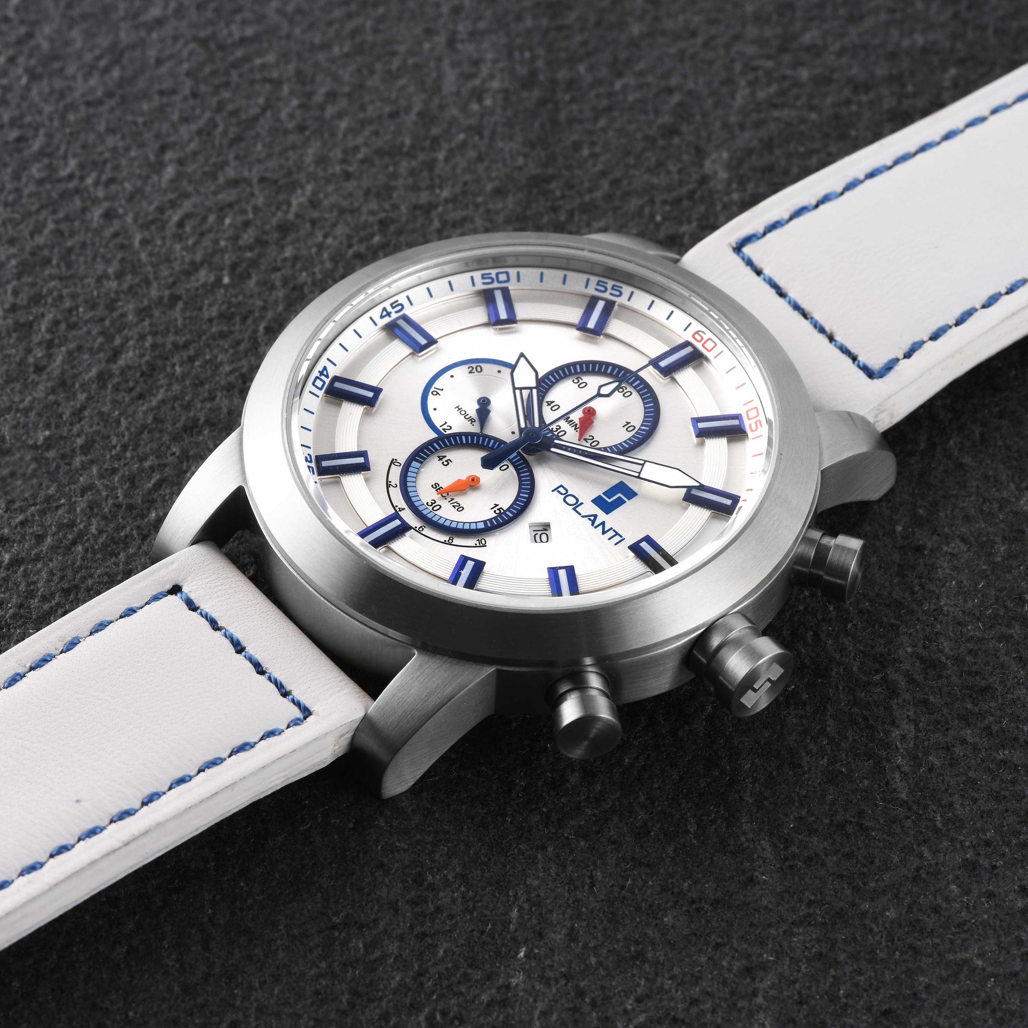 • Band: White padded leather band with blue stitches. Stainless steel U buckle