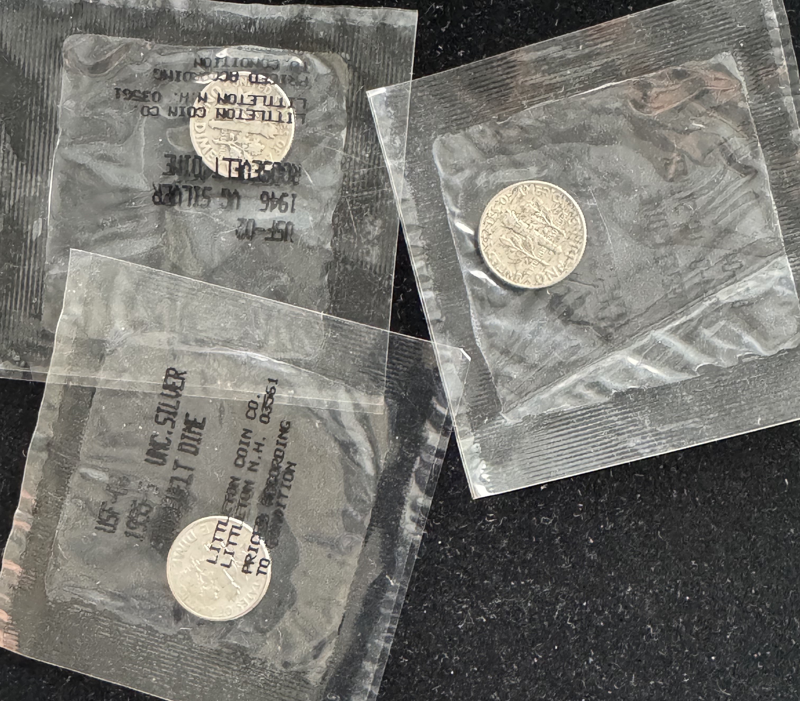 LITTLETON (3) COIN SET SILVER ROOSEVELT DIMES, 1946, 1964-D, 1955-S UNC, INDIVIDUALLY SEALED PKGS
