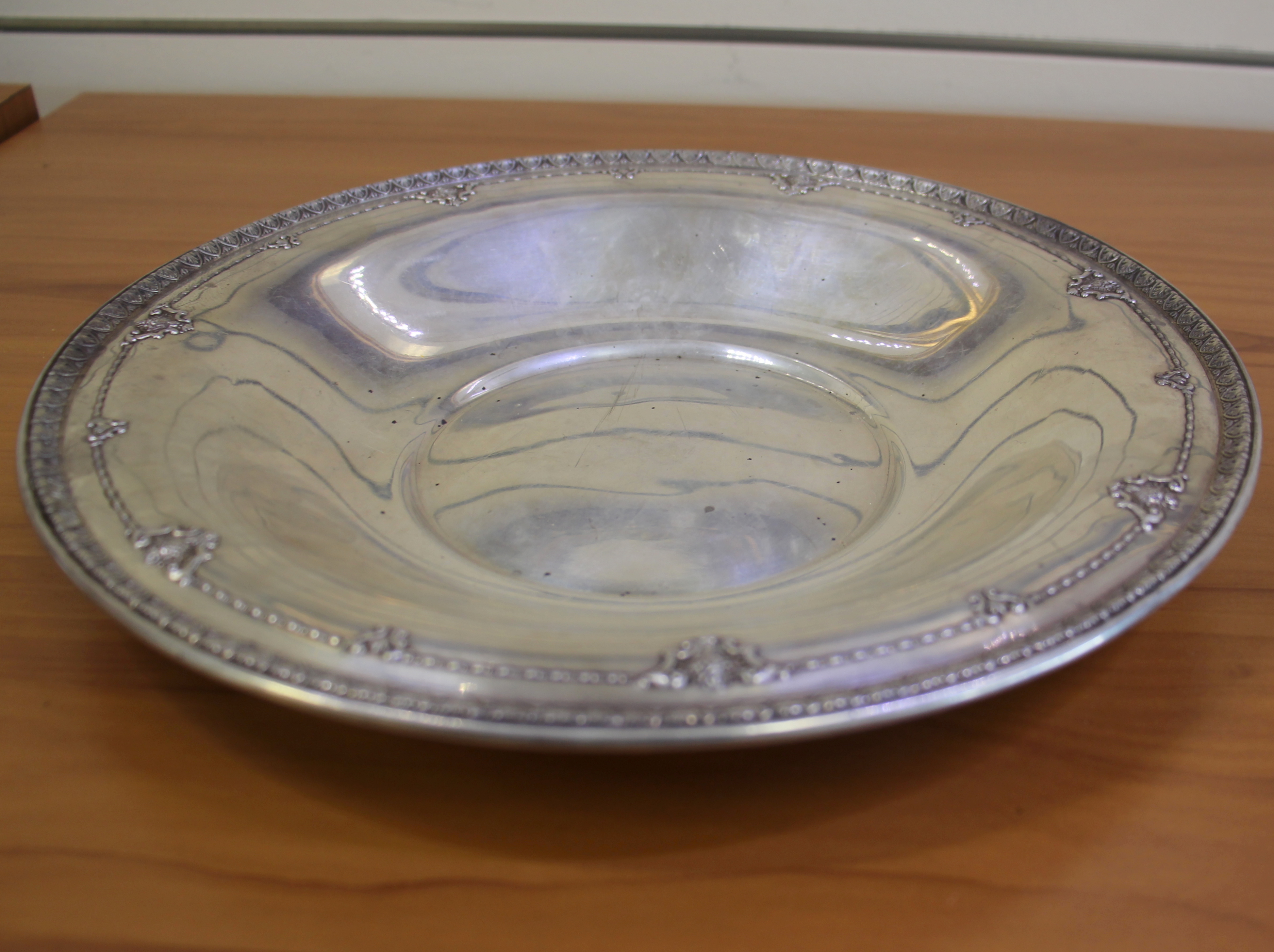 In .925 Sterling Silver. Embossed design, key style boarder, outside floral bouquet. Measures approximately 11 1/8 inches in diameter by 1 1/8 inches high. Pattern number 166 1. 378.7g.