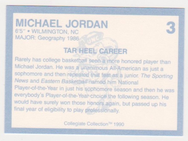 This is an original 1990 North Carolina Michael Jordan #3 college card.  It features him in his college uniform before his superstar NBA days.  This one is in approximately EX-MT condition. It has minor wear including a very small surface indentation close to the center of the front, but overall displays nicely.