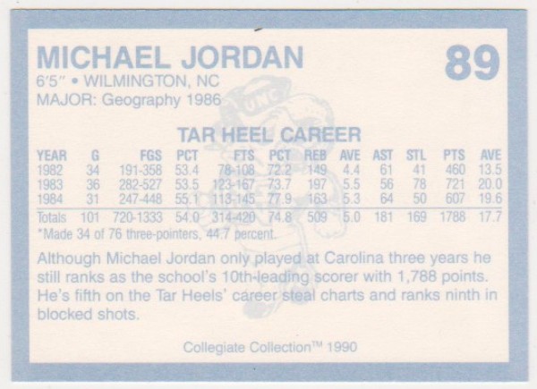 This is an original 1990 North Carolina Michael Jordan #89 college card.  It features him in his college uniform before his superstar NBA days.  This one is in approximately EX-MT condition.  It has light wear and is a little off center, but overall displays pretty well.