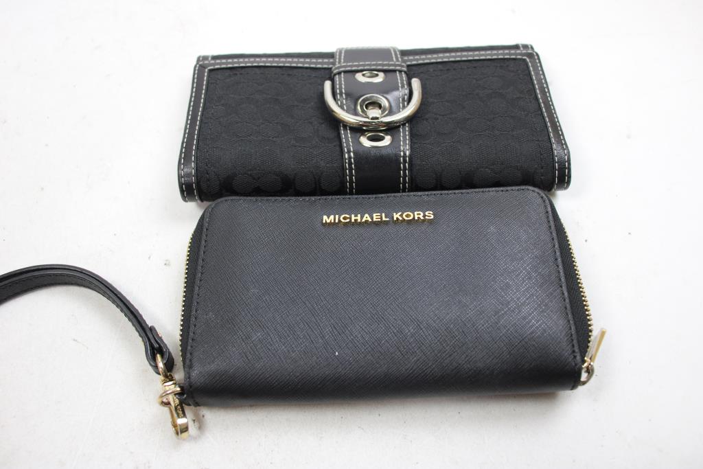 Michael Kors Pink Handbag With Black Michael Kors Wallet, And Coach Wallet