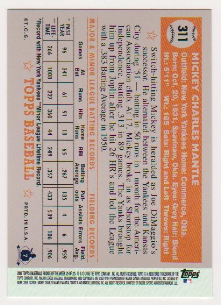 Mickey Mantle 1952 Topps #311 Rookie Commemorative Card - 2006 Topps #25 Rookie Of The Week Card