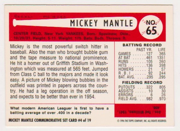Mickey Mantle 1954 Bowman #65 Commemorative Card - 1996 Topps #4 of 19 Insert Card