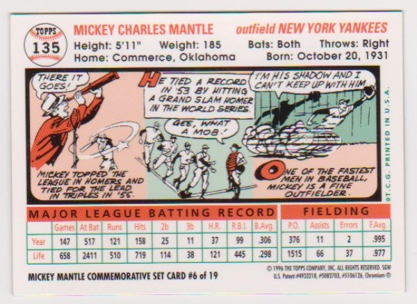 Mickey Mantle 1956 Topps #135 Commemorative Card - 1996 Topps Finest #6 of 19 Insert Card