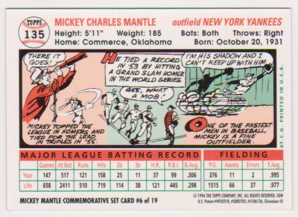 Mickey Mantle 1956 Topps #135 Commemorative Card - 1996 Topps Finest #6 of 19 Insert Card