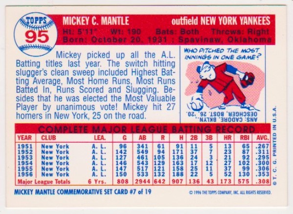 Mickey Mantle 1957 Topps #95 Commemorative Card - 1996 Topps #7 of 19 Insert Card