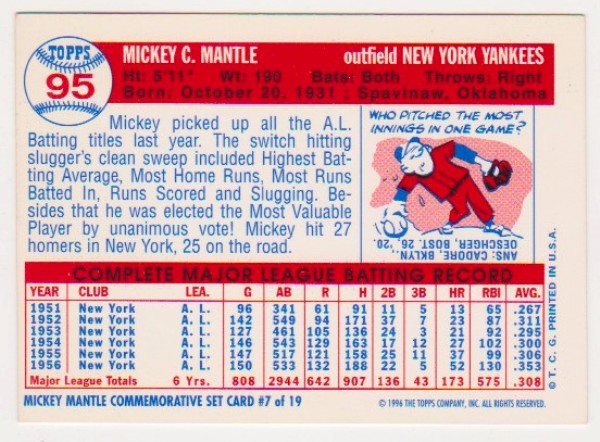 Mickey Mantle 1957 Topps #95 Commemorative Card - 1996 Topps #7 of 19 Insert Card