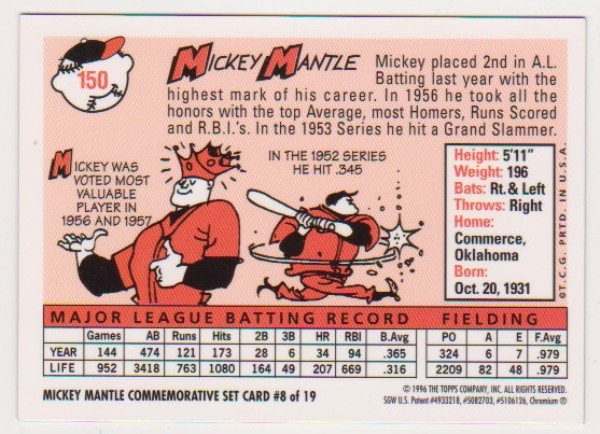 Mickey Mantle 1958 Topps Finest #150 Commemorative Card - 1996 Topps #8 of 19 Insert Card