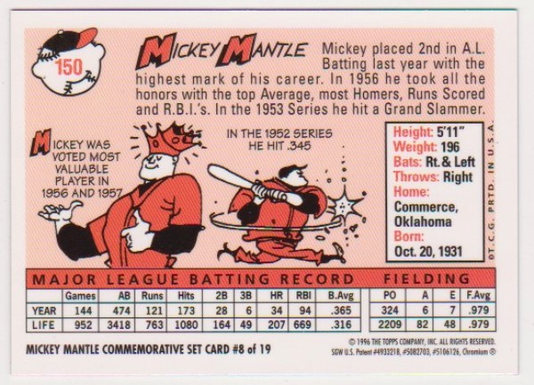 Mickey Mantle 1958 Topps Finest #150 Commemorative Card - 1996 Topps #8 of 19 Insert Card