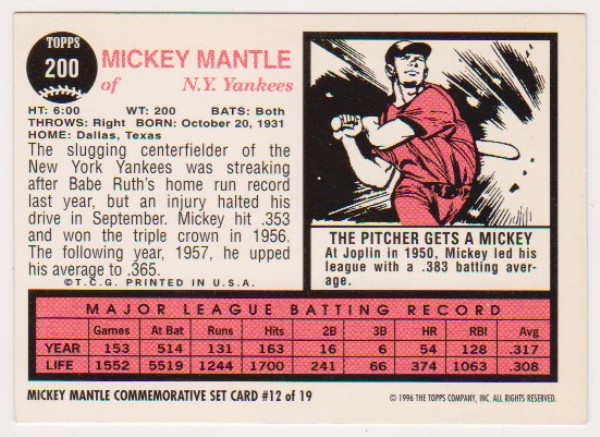 Mickey Mantle 1962 Topps #200 Commemorative Card - 1996 Topps #12 of 19 Insert Card