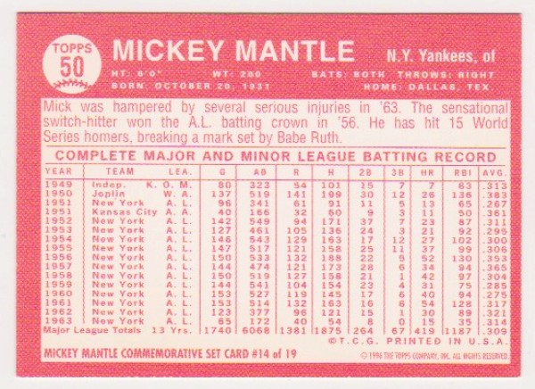 Mickey Mantle 1964 Topps #50 Commemorative Card - 1996 Topps #14 of 19 Insert Card