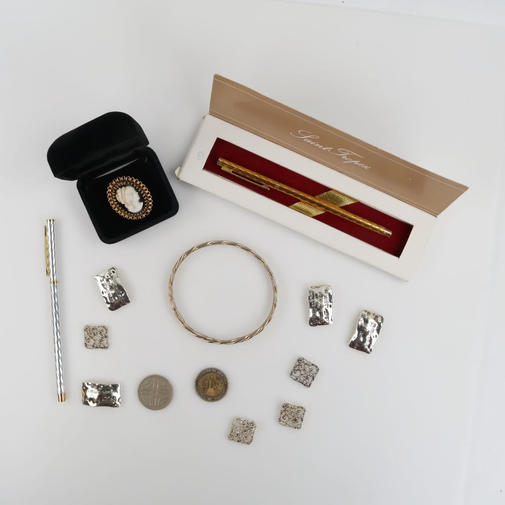 Mixed Jewelry, Set Of Pens And Foreign Currency, 7+ Pieces
