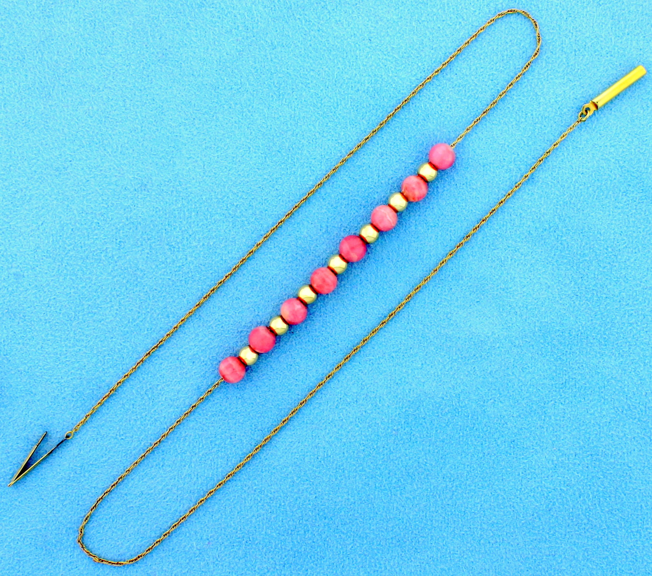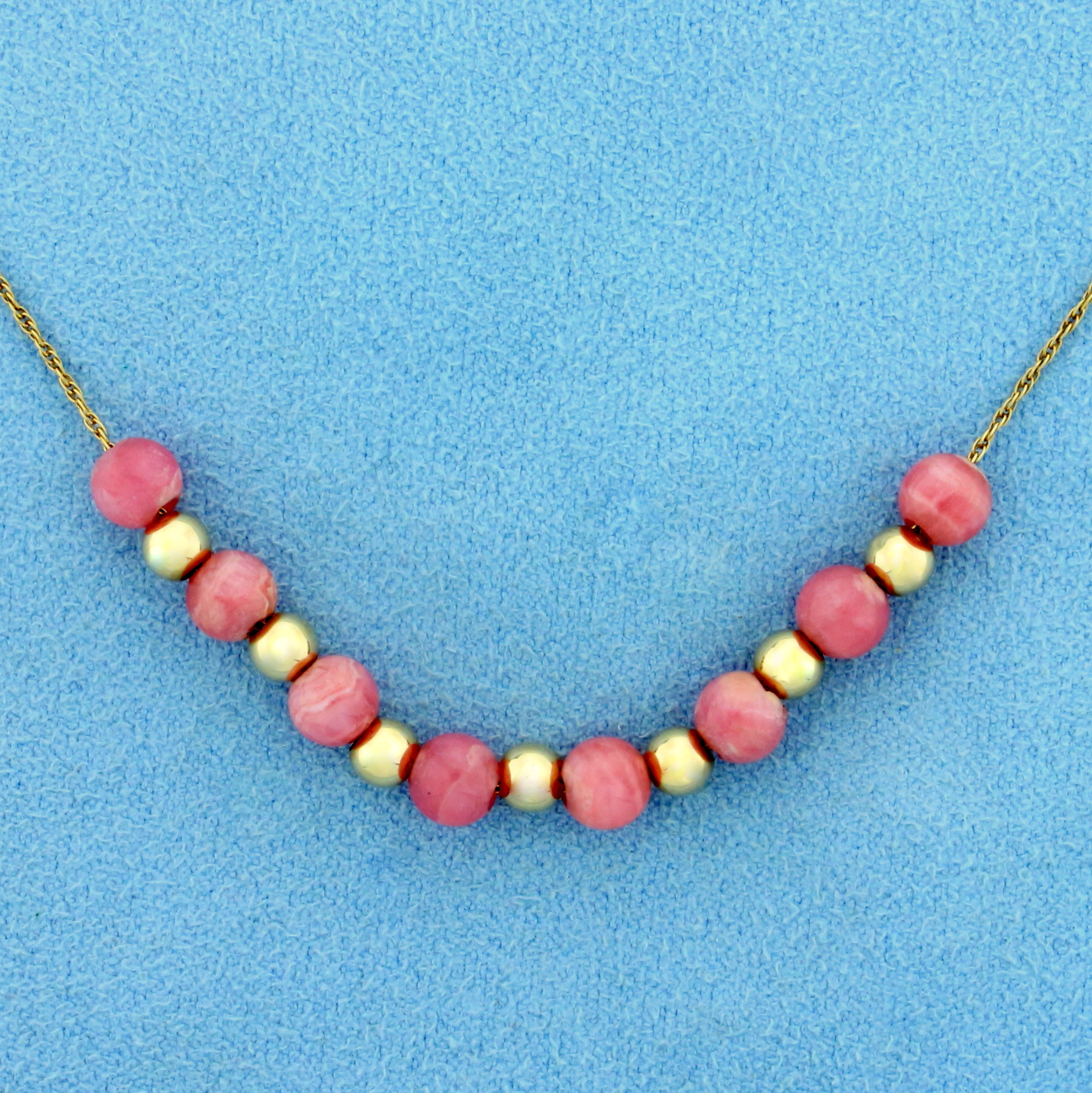 In 14K Yellow Gold. Contains eight 5.2mm high quality natural Morganite gemstone gemstones with beautiful pink salmon color. Also contains seven 3.9mm gold balls. 16 1/2 inch long rope style chain. 2.8g.