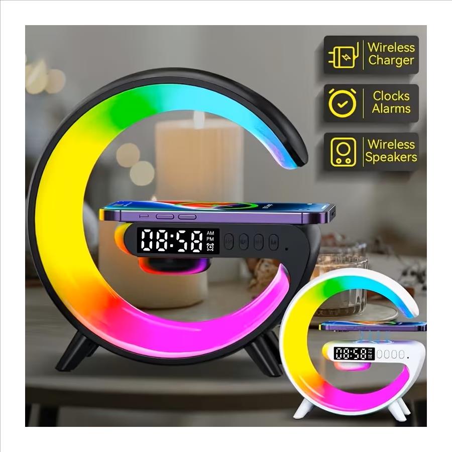 Multi-Function Wireless Charger Stand Fast Wireless Charging Station For Iphone 17 16 15 For Samsung HD Audio Subwoofer Portable Wireless Speaker Alarm Clock Colour LED Night Light RGB Light Bedside Lamp
