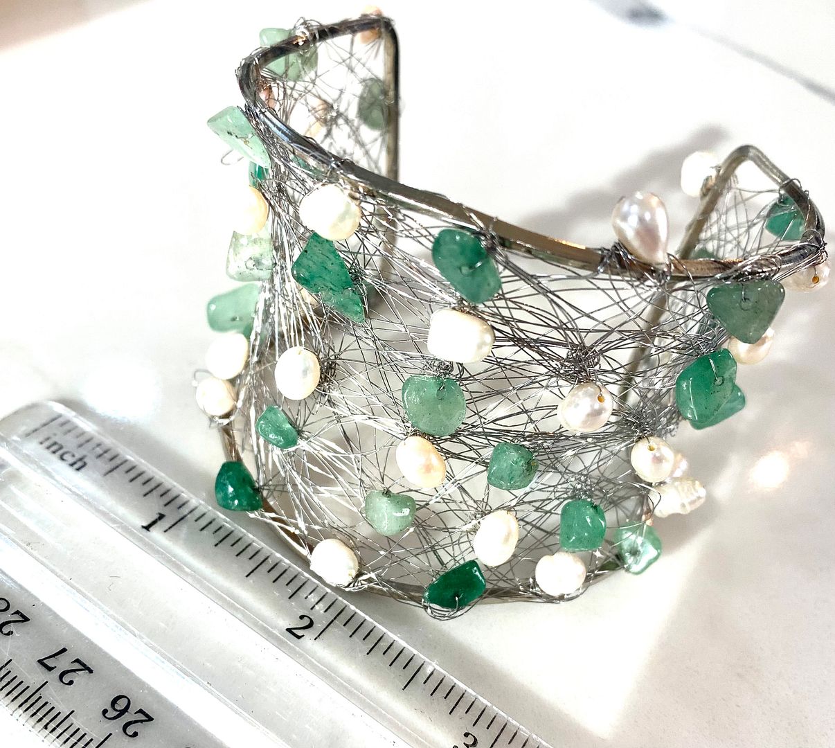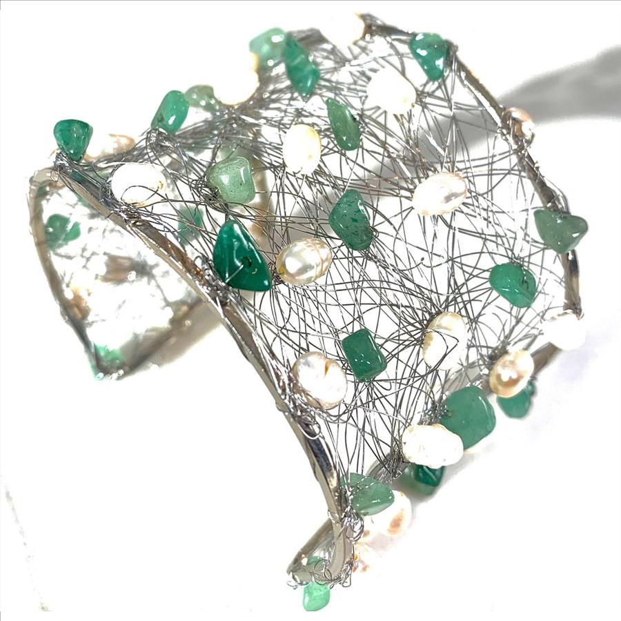 Nina Nguen Design 53 White Pearls & Emeralds Large Bangle Bracelet