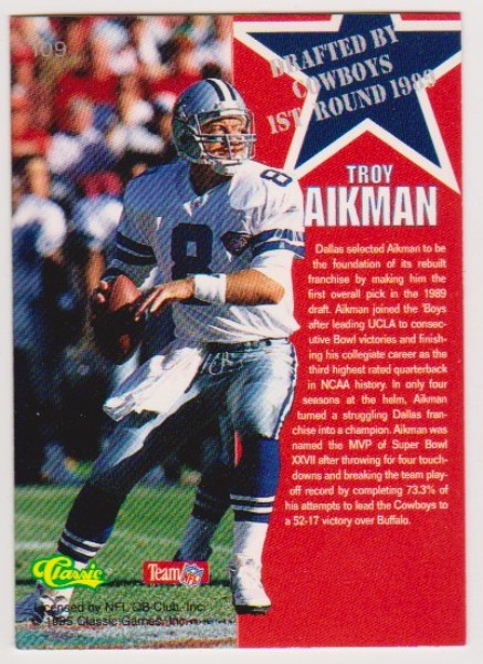 PropertyRoom.com's trusted merchant, Sports Collectibles, presents this online auction for the above Only 297 Exist - Troy Aikman 1995 Classic NFL Rookies Silver Printers Proof #109 Insert Card.