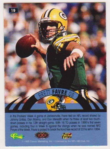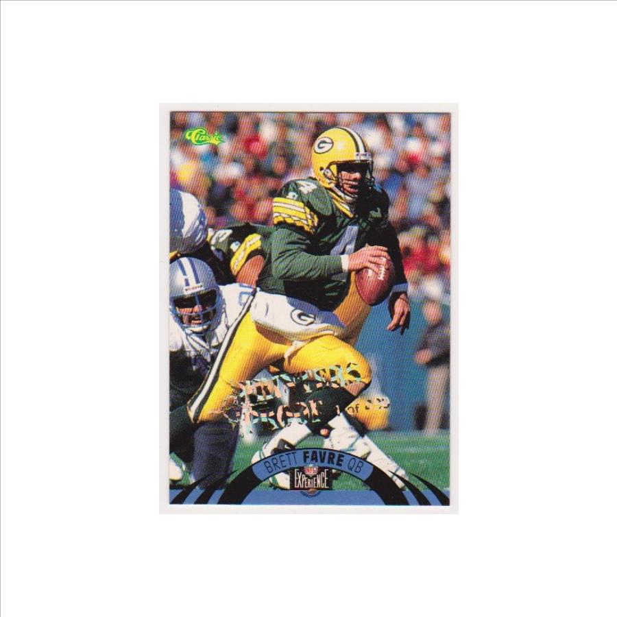 This is a 1996 Classic NFL Experience Printer's Proof Brett Favre #19 insert card.  These say "1995 Classic Marketing" on the back, but this is actually a 1996 Classic NFL Experience Super Bowl XXX Insert Card. This was an extremely tough card to pull from packs as only 499 were produced.  It is in approximately Near Mint condition.